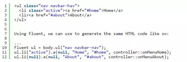 VertxUI是一个100%的Java库。由于纯HTML和CSS足以构建网页,VertxUI除了普通访问浏览器外,还提供了一种称为Fluent的轻量级流畅的API,它简化了仅使用代码构建HTML和CSS。Fluent使用与HTML标签对应的方法名称,这些方法的第一个参数总是一个CSS类。所以VertxUI没有任何模板,都是代码。使用HTML,我们定义一个Bootstrap菜单,如下所示:
