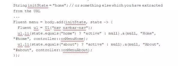 一个Bootstrap菜单示例,我们通过直接调用controller.onMenuAbout()来模拟一个菜单。让我们看看前一个改变“active”类内容的例子是否真的有效,Java到JavaScript的编译正在发生: