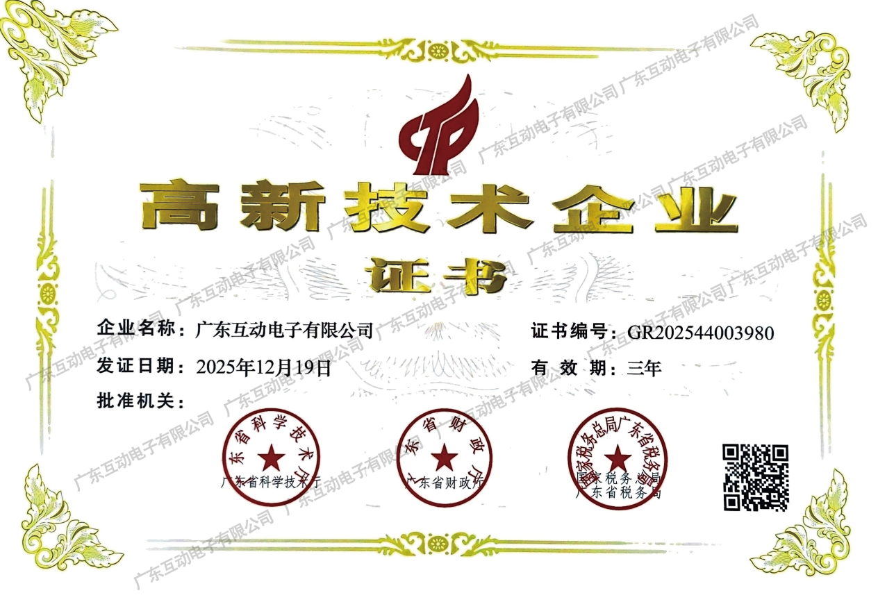 近日,广东互动电子有限公司收到由广东省科学技术厅、广东省财政厅、国家税务总局广东省税务局联合颁发的《高新技术企业证书》。这是公司连续第三次通过国家级高新技术企业认定,充分彰显了企业在自主创新、技术研发与核心竞争力方面的持续稳固实力。