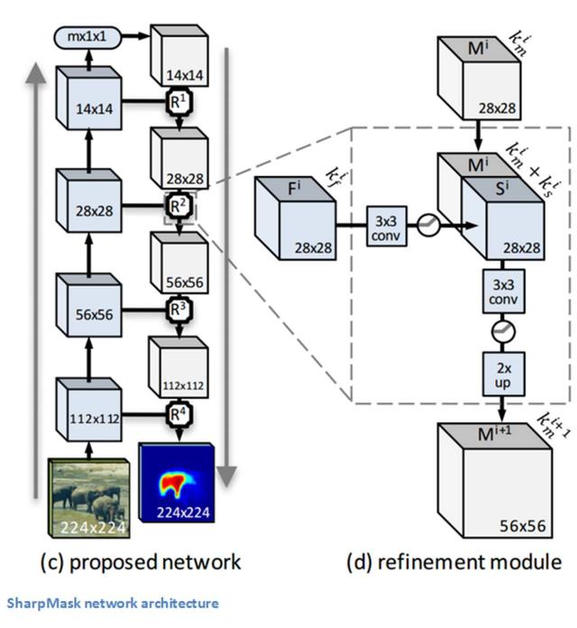 前面的作者(与 Tsung-Yi Lin 合作)也发表了一篇标题为「学习提炼对象分割块(Learning to Refine Object Segments)」的论文。正如标题所示,这篇论文的主旨是提炼 DeepMask 模型生成的分割掩码。DeepMask 的主要问题在于,它使用了一个简单的前馈网络,它在生成「粗糙对象掩码」时是很成功的,却并不能生成「精确到像素的分割」。原因是,这里运用了全图像大小的二元线性采样。这就导致了对象边界的粗糙和不精确对齐。为了解决这个问题,SharpMask 模型把网络中的浅层(early layers)的低级(low-level)特征与深层(layers deeper)的高级(high-level)的对象信息结合起来。这个模型通过首先对每一个输入部分生成一个粗糙掩码,然后将它传入网络中的不同提炼模型来实现这点。现在我们来介绍细节。