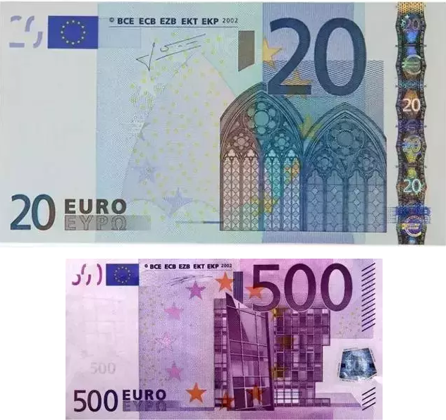 作为世界上防伪技术最先进的欧元,其中也采用了全息标识作为防伪特征之一。5、10、20欧元正面右边贴有全息薄膜条,变换角度观察可以看到明亮的欧元符号和面额数字;50、100、200、500欧元正面的右下角贴有全息薄膜块,变换角度观察可以看到明亮的主景图案和面额数字。