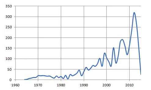 全息技术在防伪、展览展示、医疗、电视上的应用都是属于全息显示技术的具体应用。虽然全息技术发明于20世纪40年代,但是直到20世纪60年代激光光源的出现,全息技术才得以真正发展。激光是一种单色的强光,是制作全息图的理想光源。下图是从1960-2015年全息显示技术的全球申请量变化图(数据截止到2015年底,由于2014、2015年部分专利未公开造成后两年数据下滑严重)。