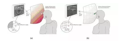 传统意义上的全息再现如图(a)所示,可以形成较大的观察区域,而SEEREAL发现,在这个大的观察区域中,除了进入瞳孔的两个视窗之外的区域,其余区域均不能被观测到,属于被浪费的信息。基于此,SEEREAL提出,仅计算对两眼视窗区域有贡献的全息图信息,并藉由眼球追踪技术追踪眼球位置,从而使观看者享受真正的全息立体图像,如图(b)。这样做一方面减少了运算的数据量,另一方面对空间光调制器像素的衍射角要求减少,使得全息图像的大小不仅仅依赖于像素间距,从而使像素面积得以适当扩大。SEEREAL的这种设计思路很巧妙地克服了目前空间调制器分辨率和数据处理能力对全息显示发展的制约。