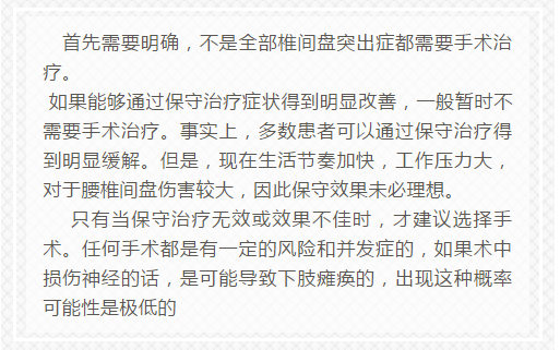 常听人说,我有“椎间盘突出”。有的人甚至“突出”很多年,到处就医,对其治疗方法了如指掌,想保守治疗,尽量不做手术。 患者最大的担心就是:1、手术万一不成功,瘫痪了怎么办? 2、手术做完后,万一复发怎么办?