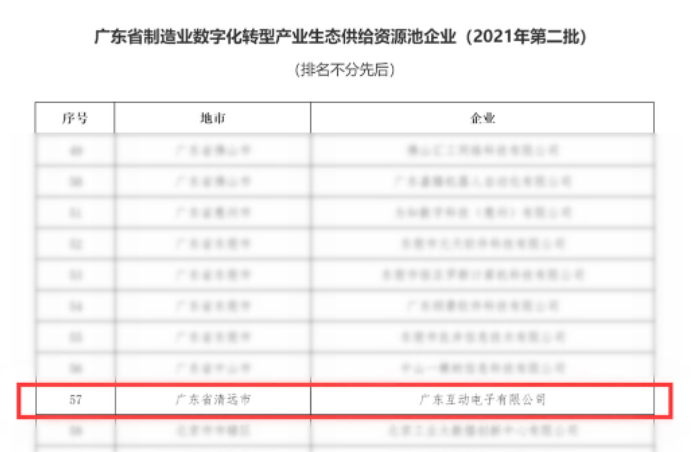 近日,广东省制造业数字化转型产业生态供给资源池企业(2021年第二批)评审结果公示,广东互动电子有限公司凭借出色的产品技术、优秀的服务案例成功入选。