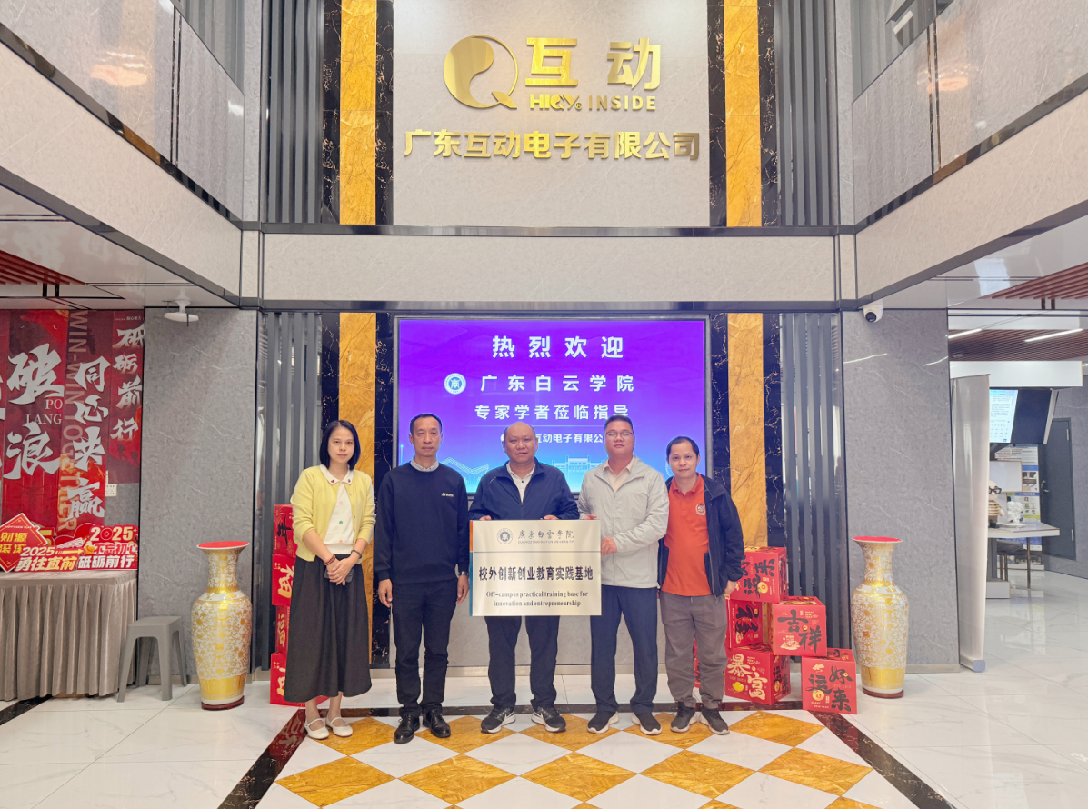 10月24日,我司与广东白云学院举行校外创新创业教育实践基地授牌仪式。广东白云学院创新创业学院办公室主任胡世雄、教育学院实习与就业干事彭辉一行莅临洽谈深化校企合作,我司董事长刘展海、副总经理何伟、刘展航出席接待并深入交流。