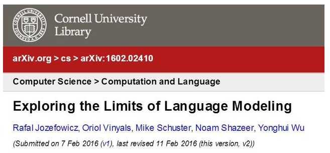 在本论文中,我们探索了最近递归神经网络用于大规模语言模型上取得的进展,主要集中于语言理解方面。我们延伸了现有的模型,处理本任务中展示的两个主要挑战:语料库和词汇量,以及语言复杂的、长期结构。我们利用「十亿单词基准」(One Billion Word Benchmark)语料库,对于一些方法进行了详尽的研究,包括针对字符的卷积神经网络,以及长短期记忆人工神经网络。我们最好的一个模型,极大地将最先进模型的 perplexity 指从 51.3 减小为 30.0(并且将参数量减少了 20 倍)。还有一个模型集成将 perplexity 值从 41.0 降低到 23.7。我们将这些模型都公开在了自然语言处理和机器学习社区上,以供他人学习的改进。