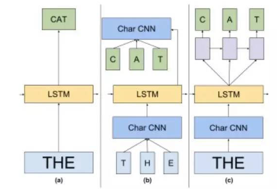 图片 1:本论文中模型的高层视图。(a)是一个标准长短词人工记忆的语言模型。(b)在这个语言模型中,输入值和 Softmax 嵌入都被替代为了字符卷积神经网络。在(c)中,我们使用预测下一字符的长短句人工记忆网络来代替 Softmax。
