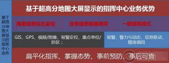 安防产业经历了从最开始的模拟数字安防到IP化安防,再到目前安防IT化等几个不同的阶段。而其中,指挥中心的建设与应用是安防代数发展中变化较大的,指挥中心的业务也呈现为几个不同的发展阶段:传统指挥中心采取的是以工作人员“看”为主的模式,这个阶段的视频图像传输方式为模拟或数字的方式;随着安防行业基于IP技术的发展,这种模式演化为视频图像基于IP网络的传输方式,这种开放式、标准化的数据传输方式为安防行业打开了广阔的发展空间。各种应用、智能、大数据分析的技术在IP传输的基础上应运而生,发展势头迅猛。指挥中心也从“原来的监控中心”发展成为“真正的指挥中心”。部分应用安防系统较早的客户,如公安行业用户对指挥业务表现出强烈的需求,而这种指挥业务呈现方式的一个重要发展方向就是以超高分辨率地图作为业务的承载基础。