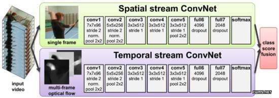 这个其实就是两个独立的神经网络了,最后再把两个模型的结果平均一下。上面一个就是普通的单帧的CNN,而且文章当中提到了,这个CNN是在ImageNet的数据上pre-train,然后在视频数据上对最后一层进行调参。下面的一个CNN网络,就是把连续几帧的光流叠起来作为CNN的输入。 另外,它利用multi-task learning来克服数据量不足的问题。其实就是CNN的最后一层连到多个softmax的层上,对应不同的数据集,这样就可以在多个数据集上进行multi-task learning。网络结构如图4所示。