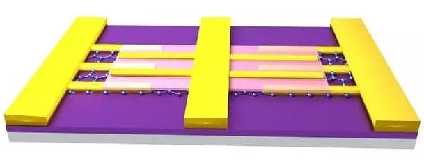 研究者首先把石墨烯转印到硅胶上,然后使用等离子刻蚀把通道图形刻在上面,接着他们使用化学气相沉积的办法在图形周围生长辉钼矿,直到生长完全,这时辉钼矿会在石墨烯上积累的厚度接近100到200纳米。