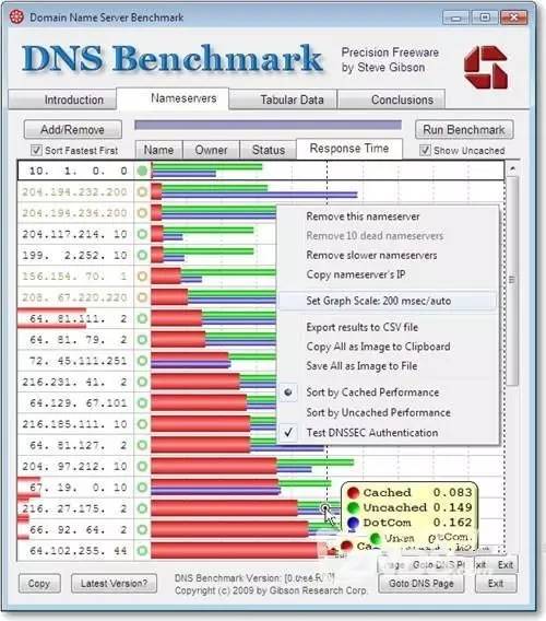 这里介绍可以试试Gibson Research DNS工具条,这个工具可以实时显示与你的主机响应速度最快的DNS服务器。你进入路由器,就可以输入工具条给出的最佳DNS服务器地址,这样设置后连接速度将大幅提升。